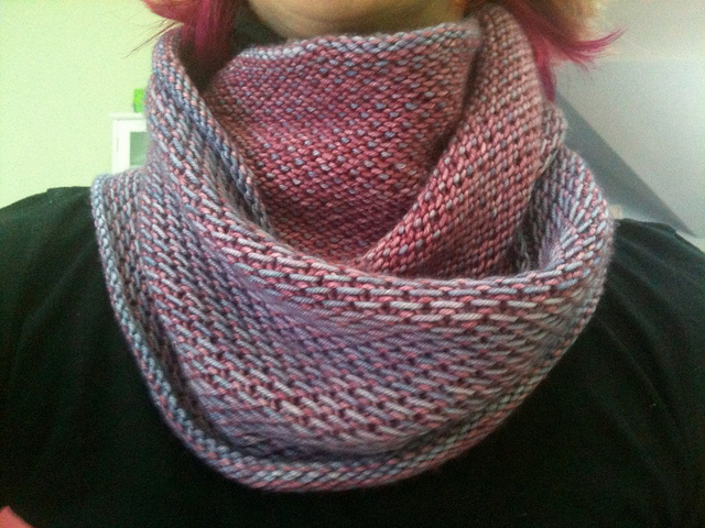 Mods: Used two colours, used one skein of each and alternated colours for each row. Also used a worsted weight instead of DK. Project page can be found here.